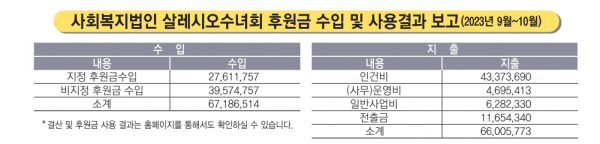 2023년 9월~10월 사회복지법인 살레시오수녀회 후원금 수입 및 사용결과를 보고합니다 페이지 정보 작성자 운영자 작성일23-12-13 15:58 조회815회 댓글0건 관련링크 이전글 다음글 목록 본문 후원금 현황입니다. 이전글 다음글 목록